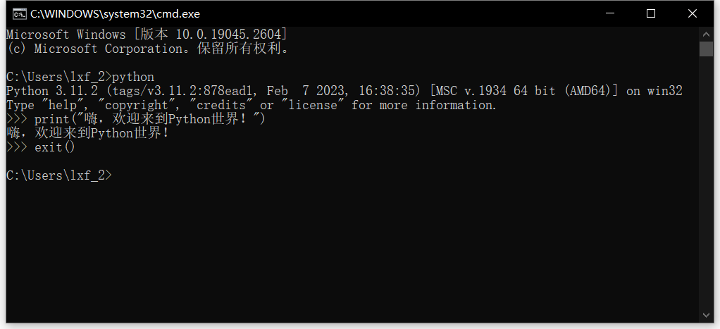 按回车键执行,即可得到“嗨,欢迎来到Python世界!”的显示信息。几乎每种编程语言教程中都会展示一下“hello, world!”程序,虽然很俗套,但不得不说Python的实现是如此的简单。紧接着执行代码“exit()”退出Python环境,完成此一阶段的测试(图4)。