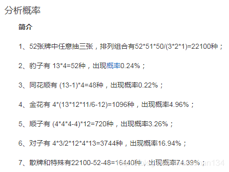 炸(诈)金花又叫三张牌,是在全国广泛流传的一种民间多人纸牌游戏。游戏使用一副除去大小王的扑克牌,共 4 个花色 52 张牌,各个玩家从中抽取 3 张牌,比较大小。各种牌型的大小顺序如下(按照全排列组合中出现的概率越小,牌型分数奖励越大):1、同花顺:三张同样花色且点数连续的牌,如红心2、红心3、红心4;2、豹子:三张点数一样的牌,如 AAA、222;3、顺子:三张点数连续的牌,如红心2、黑桃3、方块4;4、金花:三张同样花色的牌,如红心2、红心5、红心8;5、对子:两张点数一样的牌,如红心2、黑桃2;6、单张:2~10 < J < Q < K < A。以下概率截自百度百科: