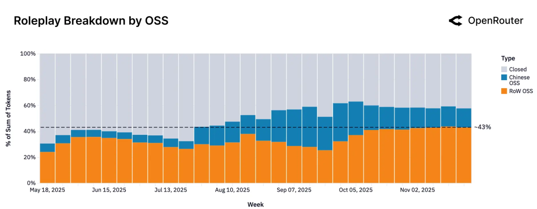 而在“角色扮演”这一类中,格局则更偏向开源与闭源两极并存,早期主要由闭源模型承载;随着开源模型能力和自由度的提升,后来角色扮演流量开始大量迁向开源,呈现出几乎对半分的状况。