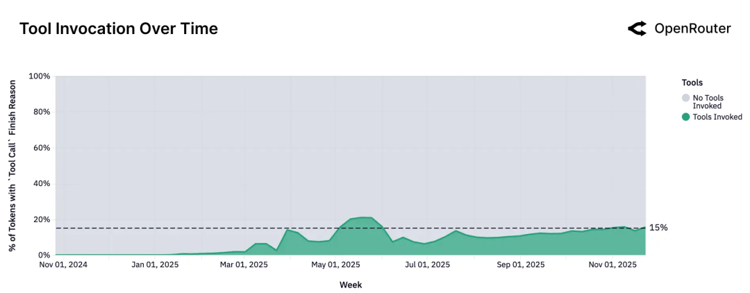 在时间维度上看,真正优化过“多步推理”的模型起初份额很小,甚至只是实验性的存在。但到 2025 年底,这类模型已经承担了超过 50% 的 token 流量。