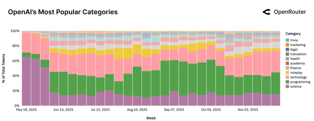 四是****OpenAI,一开始,科学类问题占了很大比例(尤其是和 Machine Learning & AI 相关);随着新模型推出,编程 + 技术任务比例持续提高,年末已经超过一半;Roleplay 和日常聊天类请求占比显著下降,整体使用呈现“专业化”趋势。