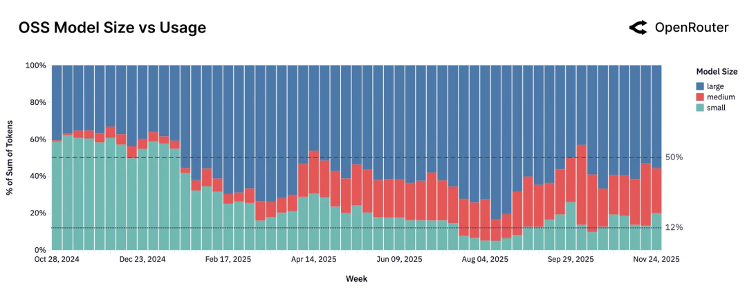 **三是大模型并未出现单一王者。**在 ≥70B 这个档位上,并没有哪一个模型吃掉绝大部分流量;Qwen3 235B、GLM 4.5 Air、GPT-OSS-120B 等都保持了一定份额。