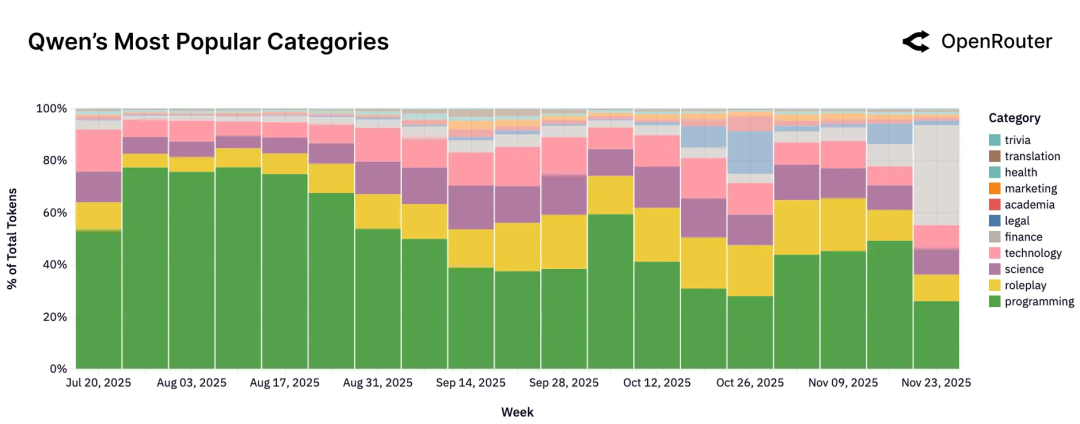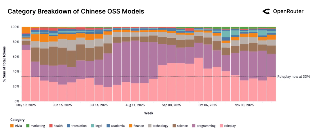 如果单独抽出“中国开源模型”来看,结构又有些不同。角色扮演****仍然是最大的类别,占比约33%,但编程和技术领域的使用量合计已占多数,达到39%。