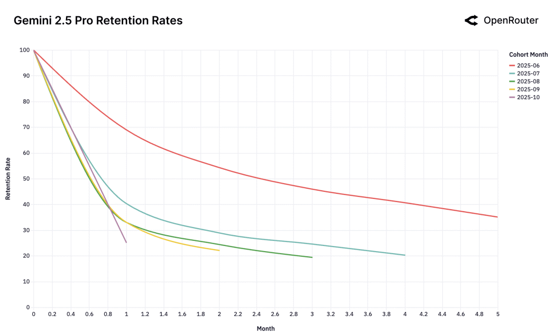 比如,Gemini 2.5 Pro 的 2025 年 6 月 cohort、Claude 4 Sonnet 的 2025 年 5 月 cohort,都展现出这种“高而稳定”的留存特征。