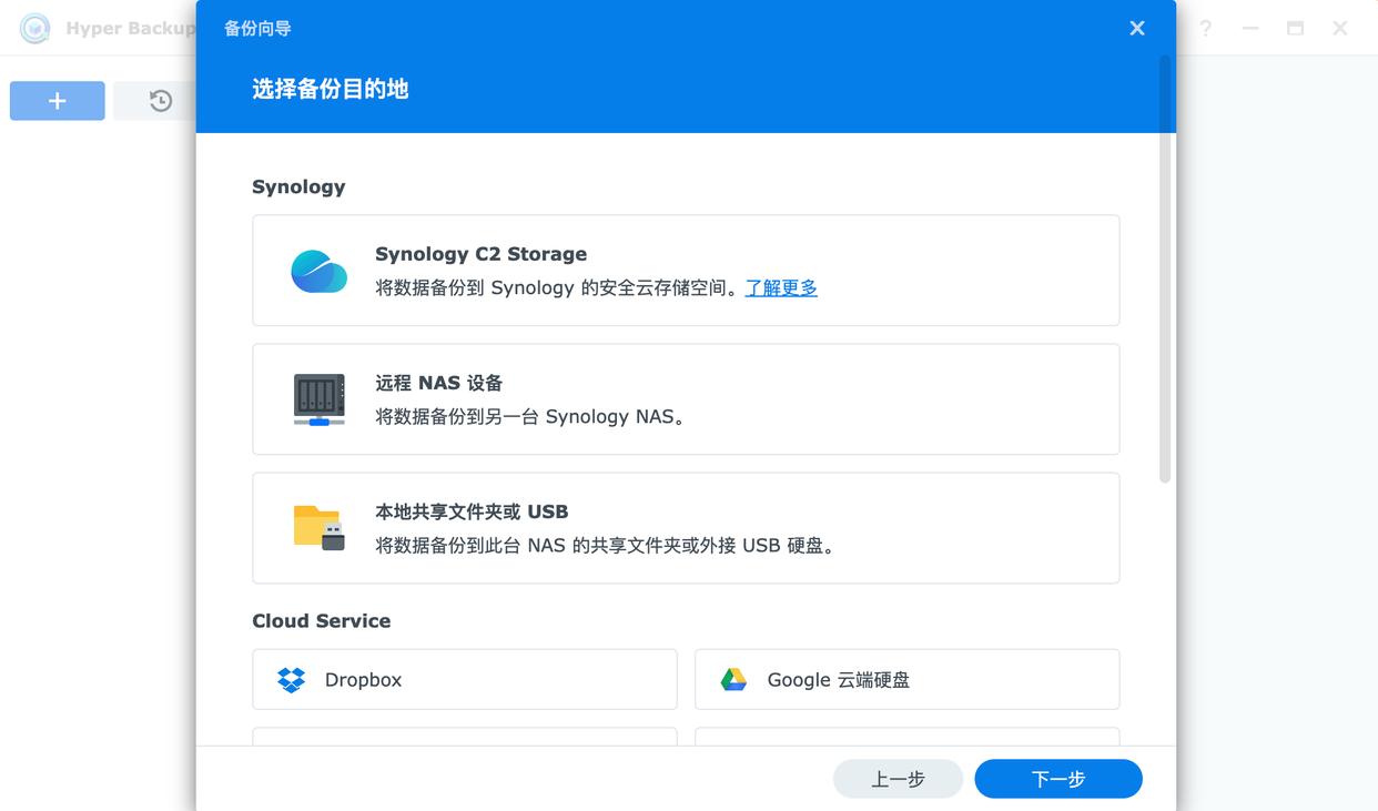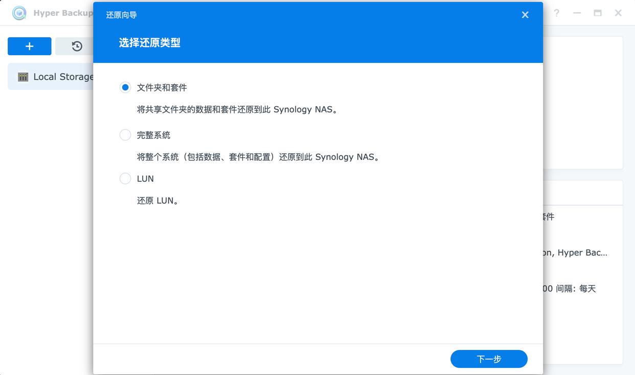 备份时建议选择多版本备份,随后就可以根据指引选择,需要迁移的文件、套件和设置,然后只需要慢慢等待即可,完成传输之后,在 B 上打开 Hyper Backup,点击【还原】图标,选择对应的还原类型