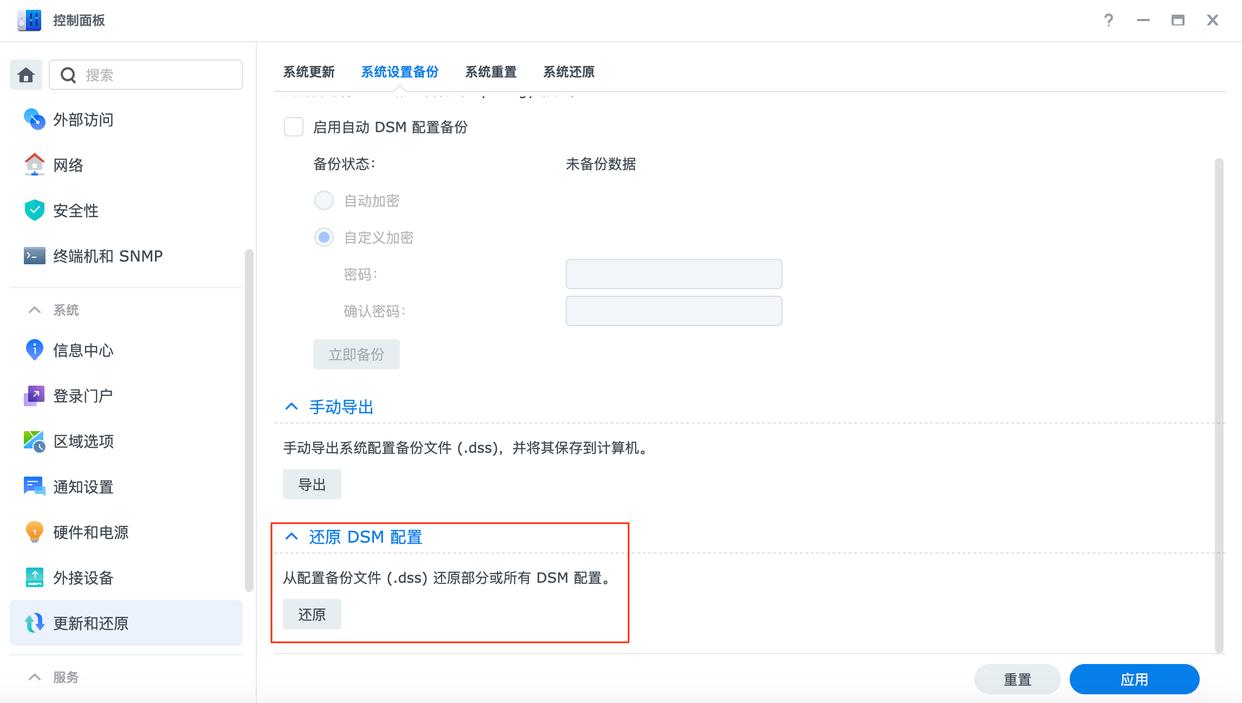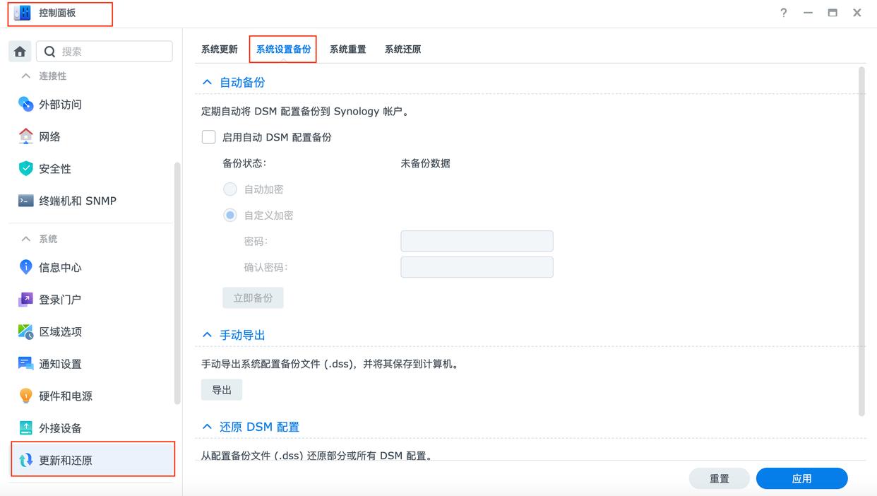 先依次点击【控制面板】>【更新和还原】>【系统设置备份】中,将配置文件手动导出,也可以设置【自动备份】后点击立即备份,后续会定期自动备份 DSM 配置