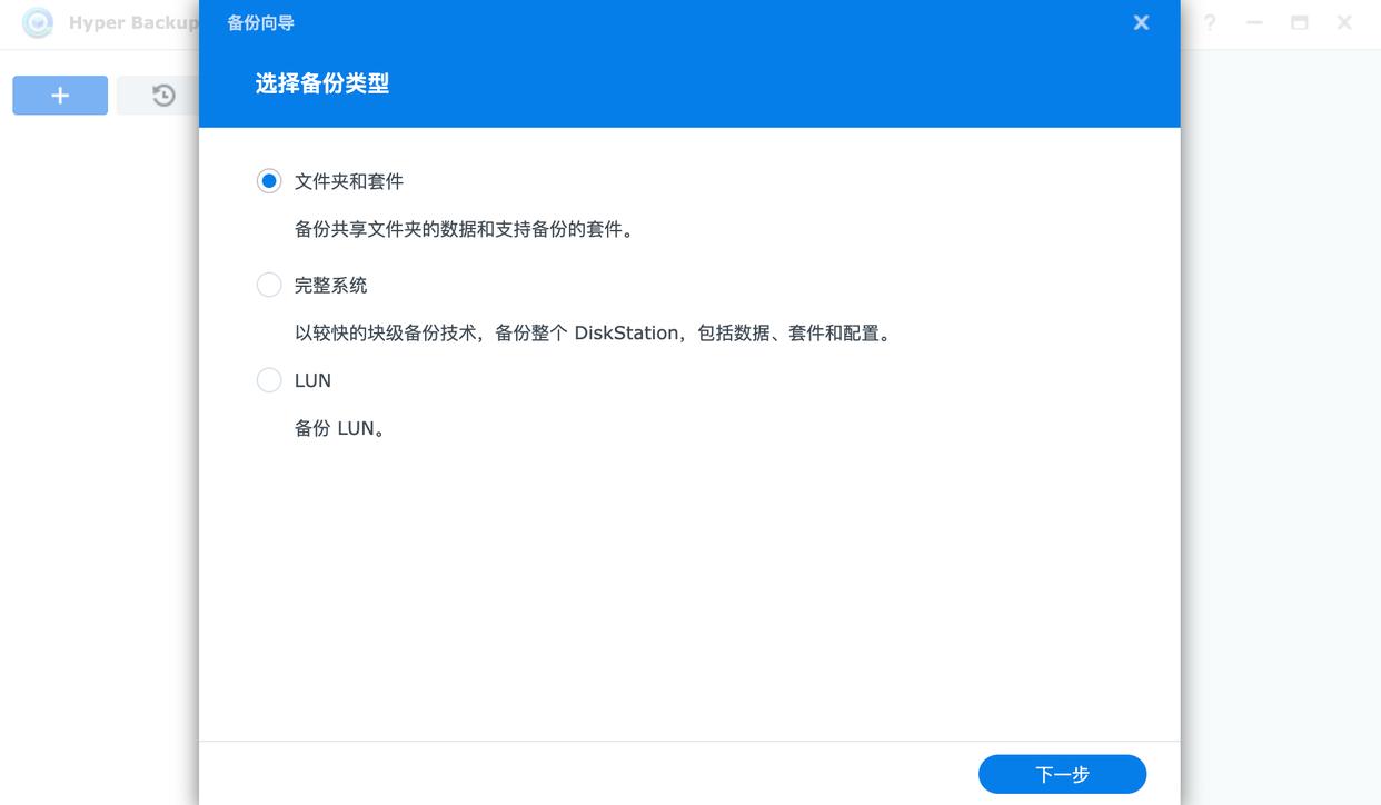 再在 A 上打开 Hyper Backup,点击左上角的+,新建【数据备份任务】,选择所要备份的数据类型