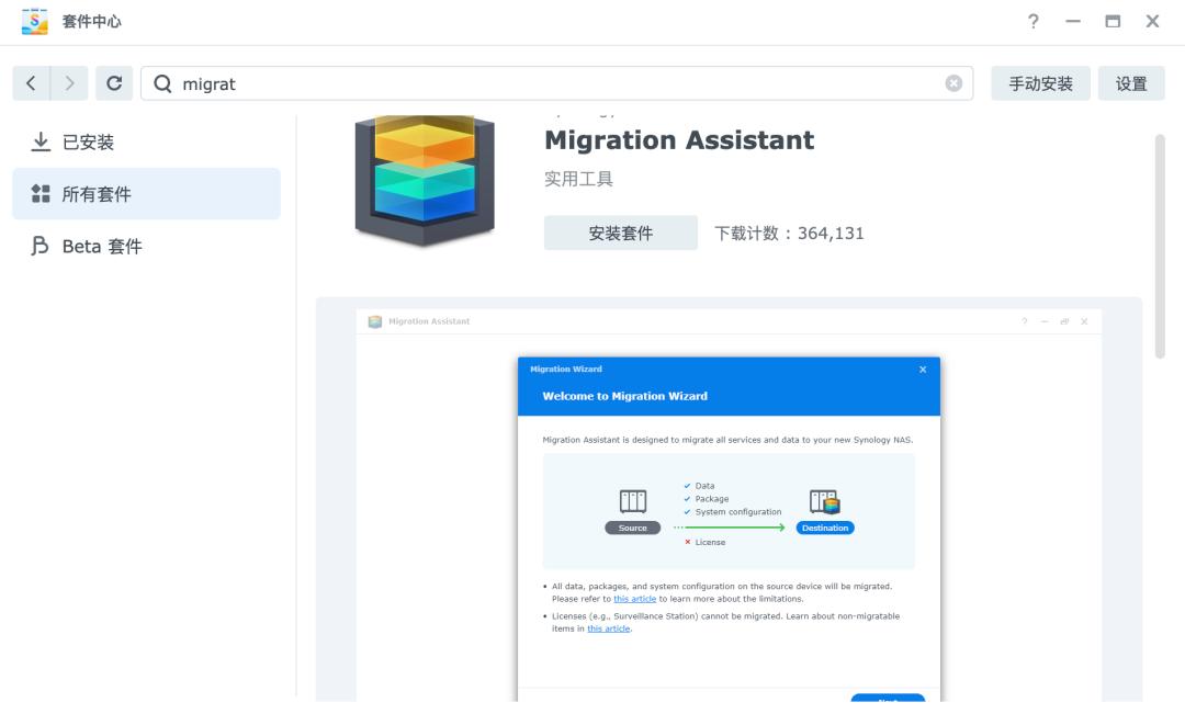 只需在套件中心中下载并按照套件的指引,简单几步即可完成迁移