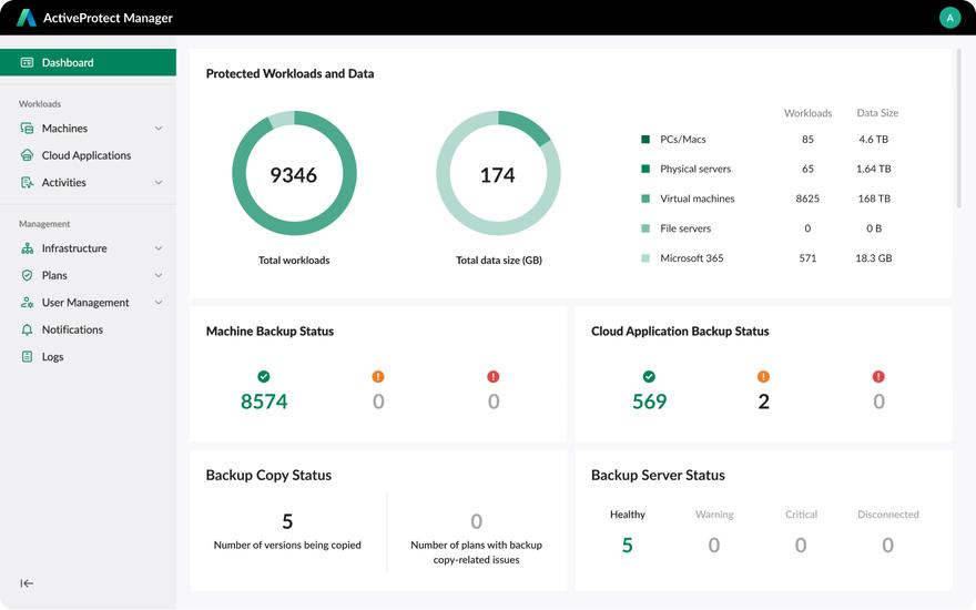 Synology ActiveProtect 备份专用一体机整合了软硬件,与传统需 IT 自行整合的备份方案相比,能有效降低总体拥有成本。ActiveProtect 可集中保护多达 15 万个工作负载,覆盖 2,500 个站点,包括虚拟机、服务器、数据库、终端设备和 SaaS 服务。