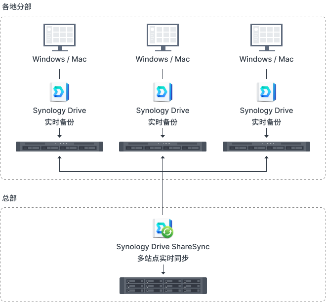 文件首先上传至总部 NAS 后,系统会通过 Drive ShareSync 自动、实时地同步到各分部 NAS 中。无论分布在哪个城市、哪个区域,分部都能第一时间获取最新资料,确保内部流程统一、信息不滞后。