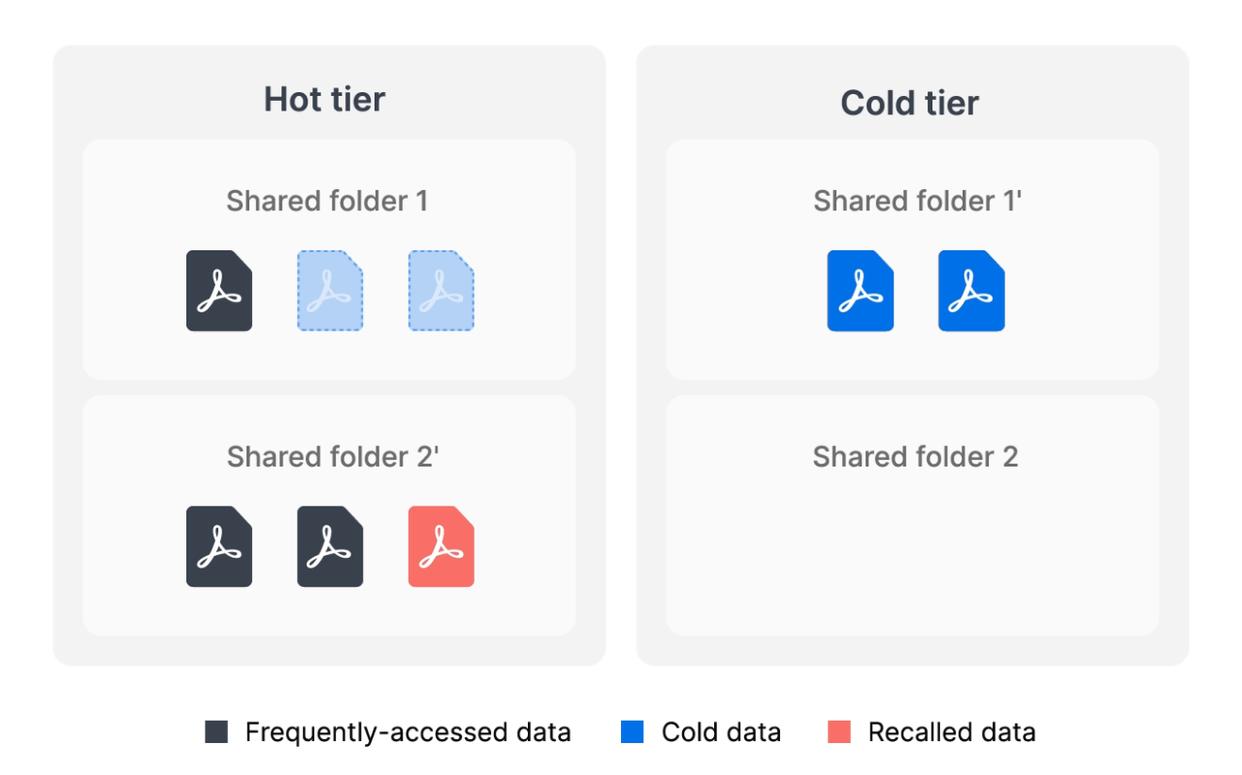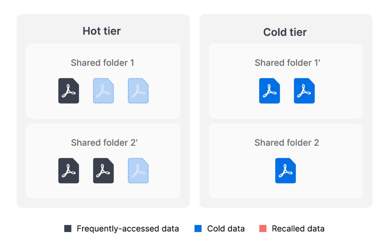 Synology Tiering 数据分层提供了易用且可扩展的分层管理方案,并且支持自定义分层策略,实现自动迁移。对于以大容量文件、媒体影像、边缘数据、周期性强的项目文件为主的企业来说,更能体现经济效益。