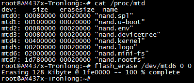执行如下命令查询NAND FLASH分区,确认MTD6分区大小(读写请勿超出分区大小),将该分区内容擦除。
