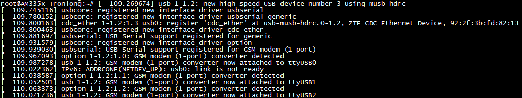 4G模块插到评估板后,可在串口终端看到如下打印信息,说明驱动已自动正常加载。4G模块灯亮,说明已正常连接,若灯不亮,请检测SIM卡和天线是否正常安装。