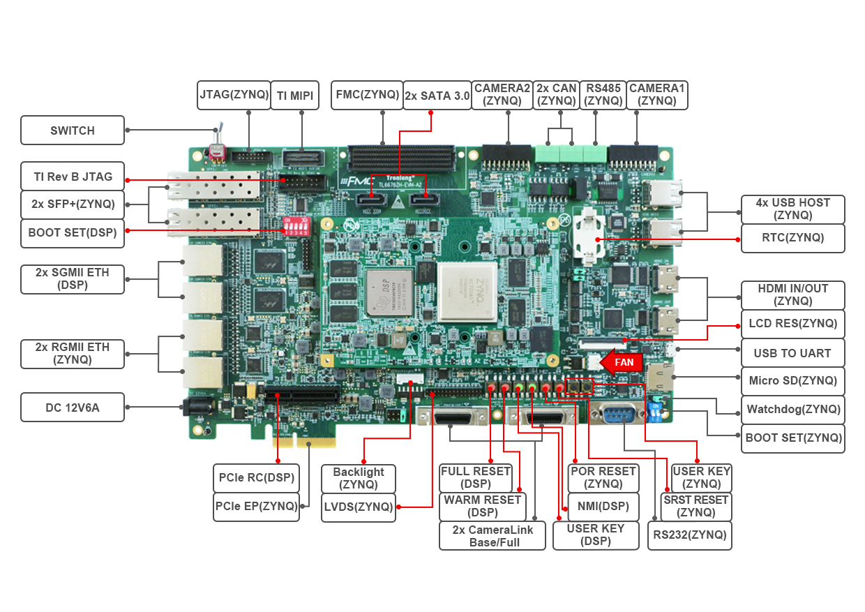 本次测试板卡为TMS320C6678开发板,它是一款基于TI KeyStone架构C6000系列TMS320C6678八核C66x定点/浮点DSP,以及Xilinx Zynq-7000系列XC7Z045/XC7Z100 SoC处理器设计的高端异构多核评估板,TMS320C6678开发板每核心主频可高达1.25GHz,XC7Z045/XC7Z100集成PS端双核ARM Cortex-A9 + PL端Kintex-7架构28nm可编程逻辑资源,引出双路CameraLink、双路SFP+光口、四路千兆网口、双路SATA、双路PCIe、四路USB、双路CAN、双路CAMERA、HDMI IN/OUT、LVDS、LCD、RS485、RS232、Micro SD、HPC FMC等接口。