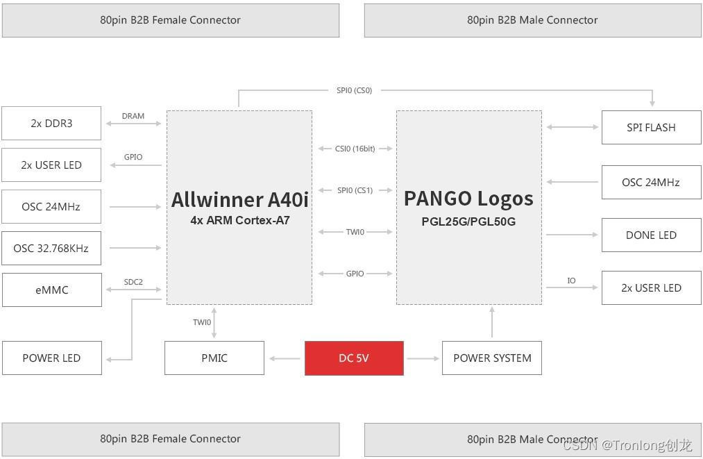 SOM-TLA40iF核心板板载ARM、FPGA、ROM、RAM、晶振、电源、LED等硬件资源,并通过B2B连接方式引出IO。核心板所有器件(包括B2B连接器)均采用国产工业级方案,国产化率100%。