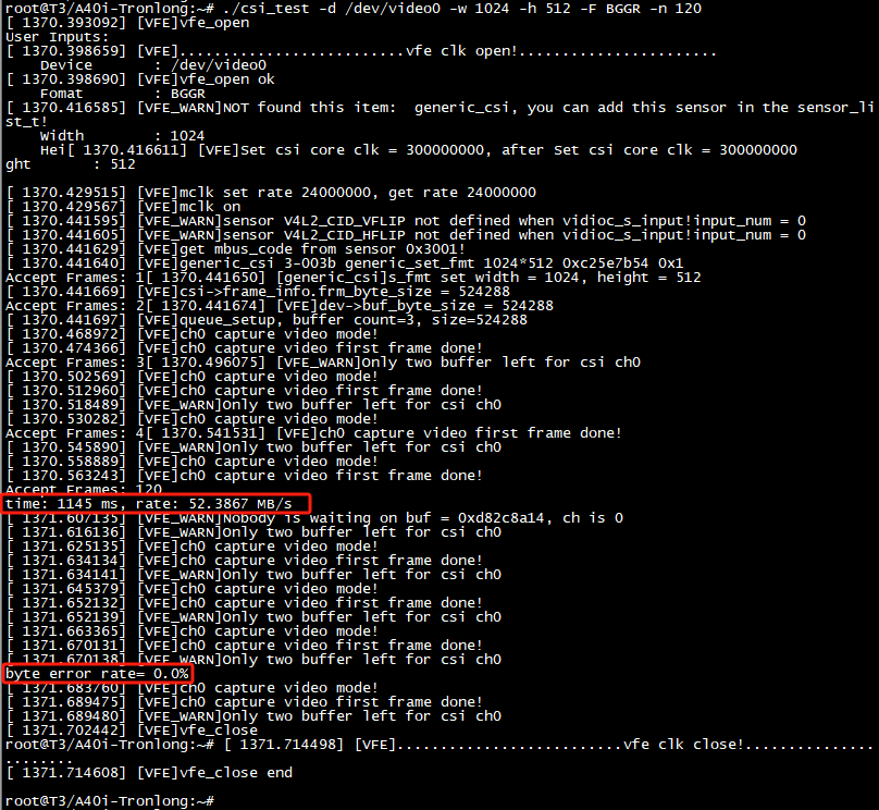 (4)打印平均采集速率,并校验最后一帧图像的数据。