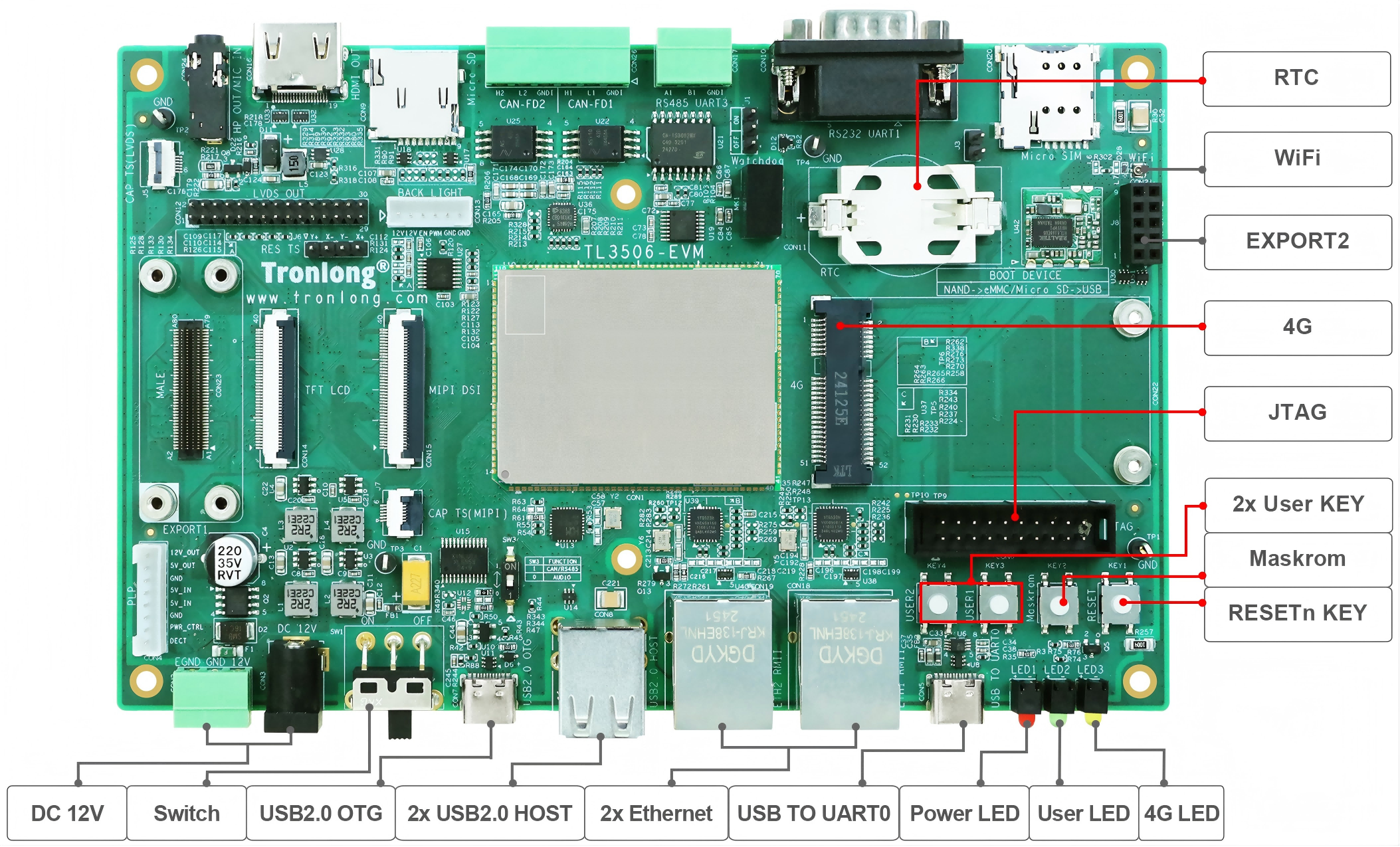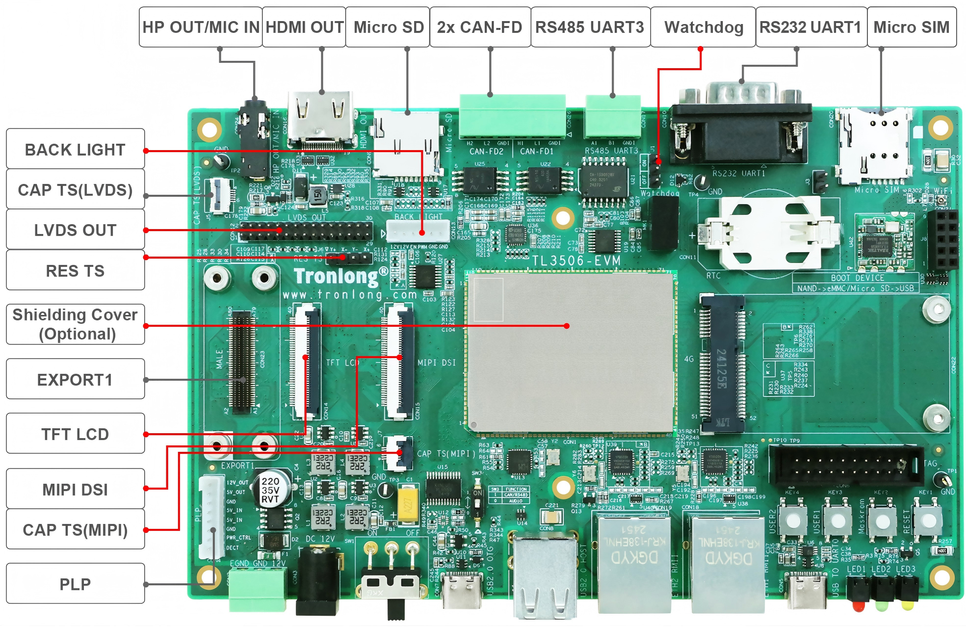 评估板接口资源丰富,引出2路Ethernet、3路USB2.0、2路CAN-FD、RS485、RS232等通信接口,同时引出LVDS OUT、MIPI DSI、HDMI OUT、TFT LCD、HP OUT/MIC IN等音视频多媒体接口。评估板板载WiFi模块,支持选配4G模块、PLP断电保护模块,并可选配外壳直接应用于工业现场,方便用户快速进行产品方案评估与技术预研。