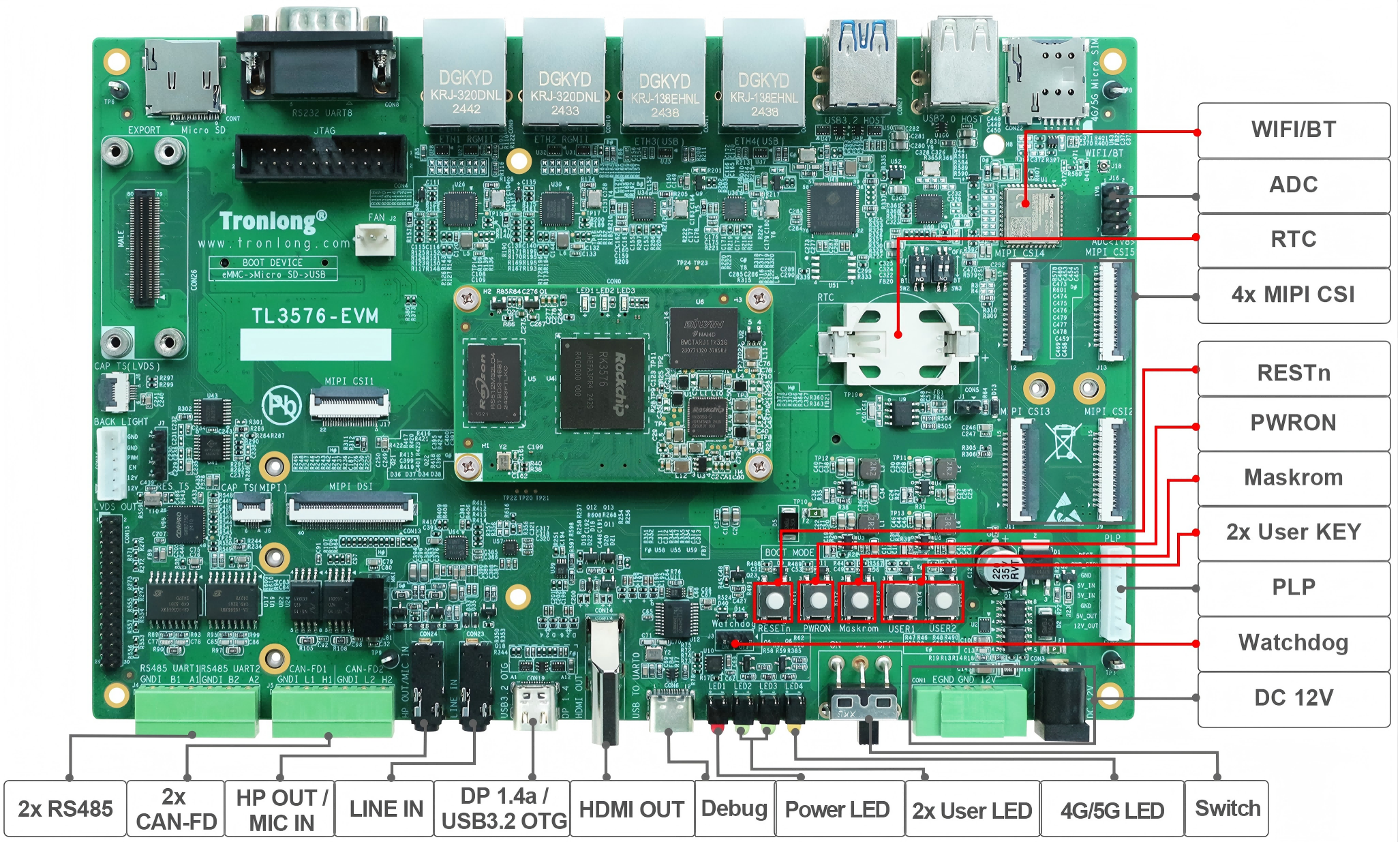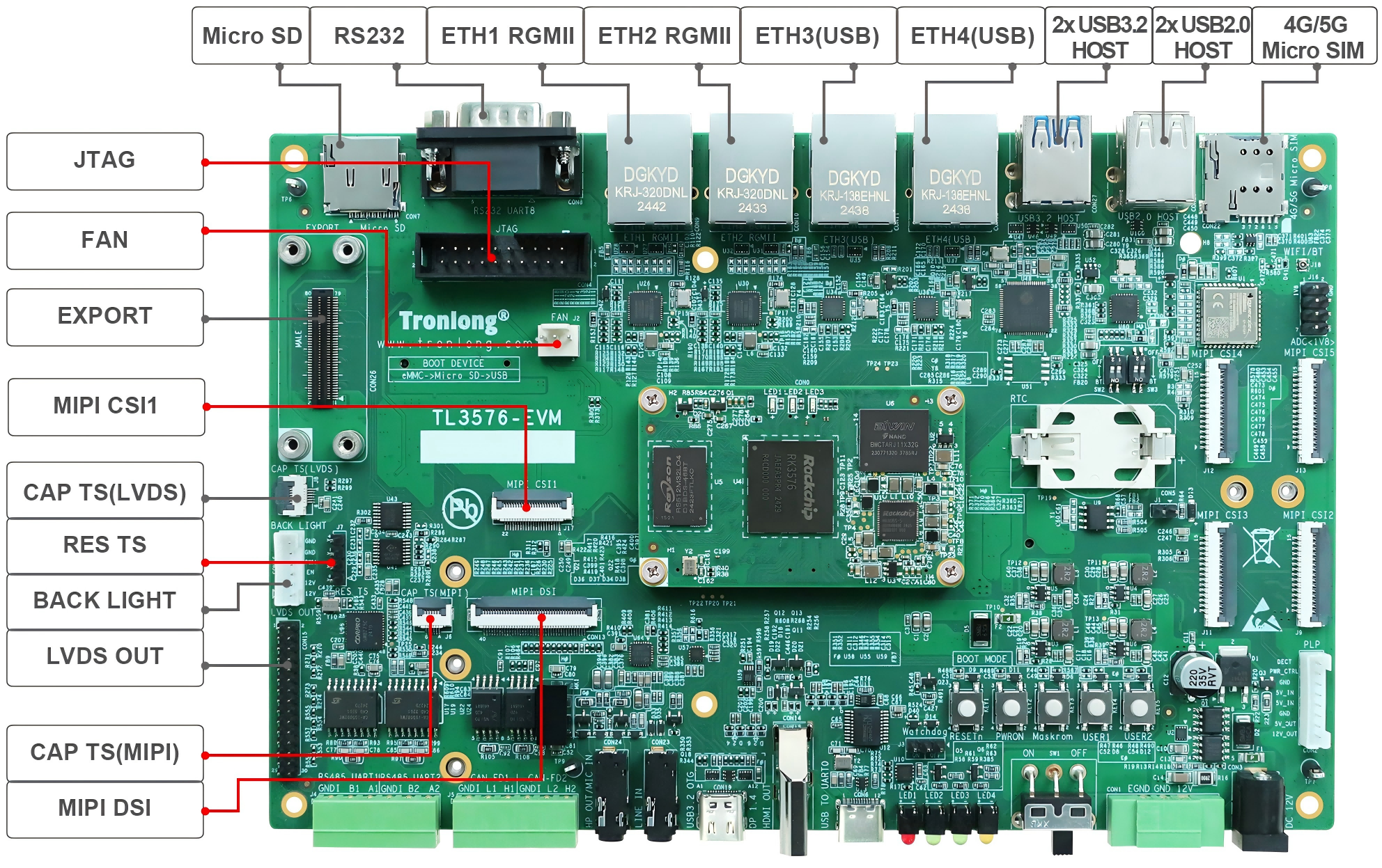 创龙科技 TL3576-EVM 是一款基于瑞芯微 RK3576J/RK3576高性能处理器设计的4核ARM Cortex-A72 +4核 ARM Cortex-A53 + ARM Cortex-M0 国产工业评估板,Cortex-A72 核心主频高达 2.2GHz,Cortex-A53 核心主频高达 2.0GHz。评估板由核心板和评估底板组成,核心板 CPU、ROM、RAM、电源、晶振、连接器等所有元器件均采用国产工业级方案,国产化率100%。同时,评估底板大部分元器件亦采用国产工业级方案,国产化率约为 99%(按元器件数量占比,数据仅供参考)。核心板经过专业的PCBLayout 和高低温测试验证,质量稳定可靠,可满足各种工业应用环境要求。