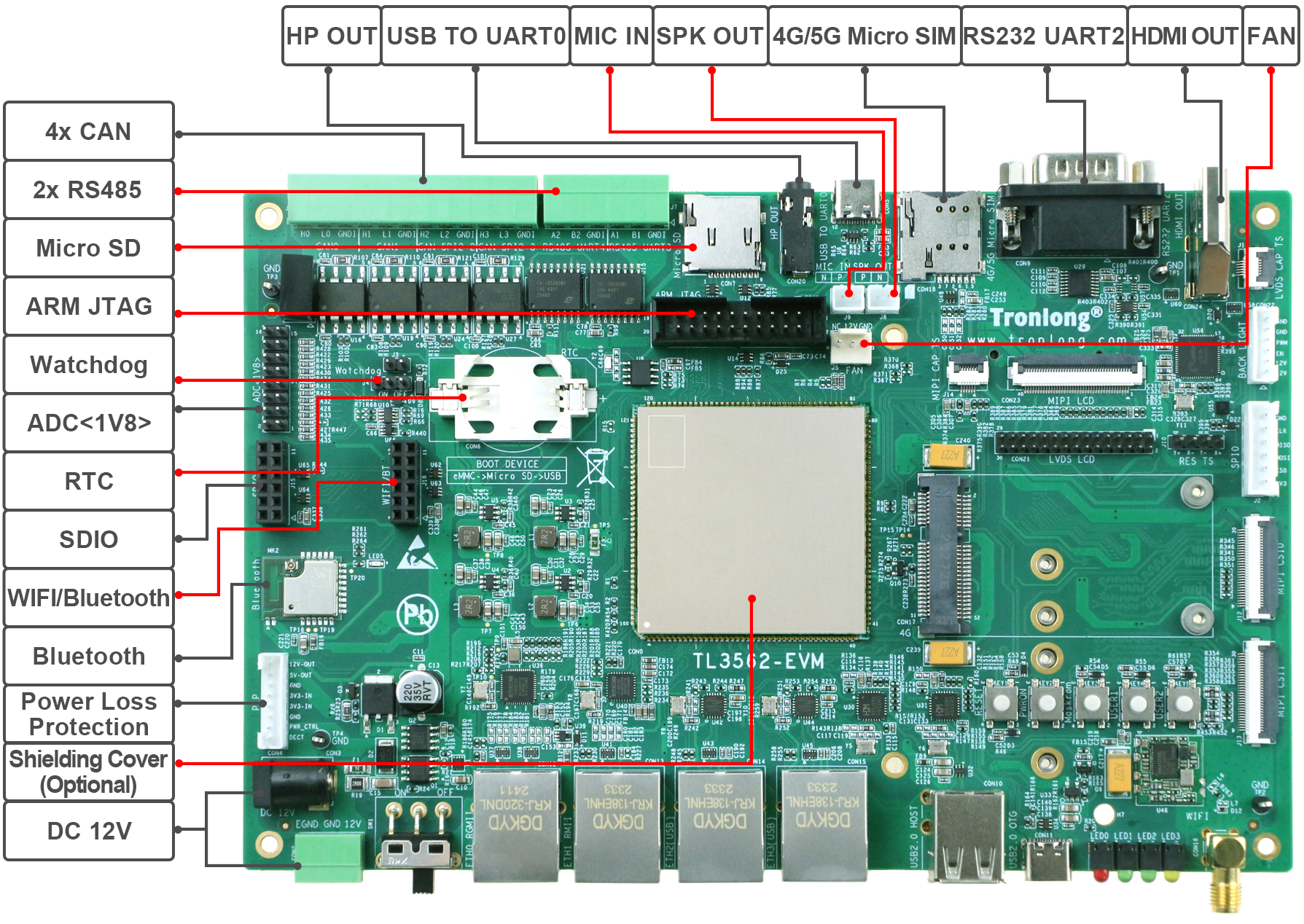 创龙科技 TL3562-EVM-B 是一款基于瑞芯微 RK3562J/RK3562 处理器设计的四核 ARMCortex-A53 +单核 ARM Cortex-M0 国产工业评估板,主频高达 2.0GHz。评估板由核心板和评估底板组成,核心板 CPU、ROM、RAM、电源、晶振、连接器等所有元器件均采用国产工业级方案,国产化率 100%。评估底板大部分元器件亦采用国产工业级方案,国产化率约 99%(按元器件数量占比,数据仅供参考)。核心板经过专业的PCBLayout 和高低温测试验证,质量稳定可靠,可满足各种工业应用环境要求。