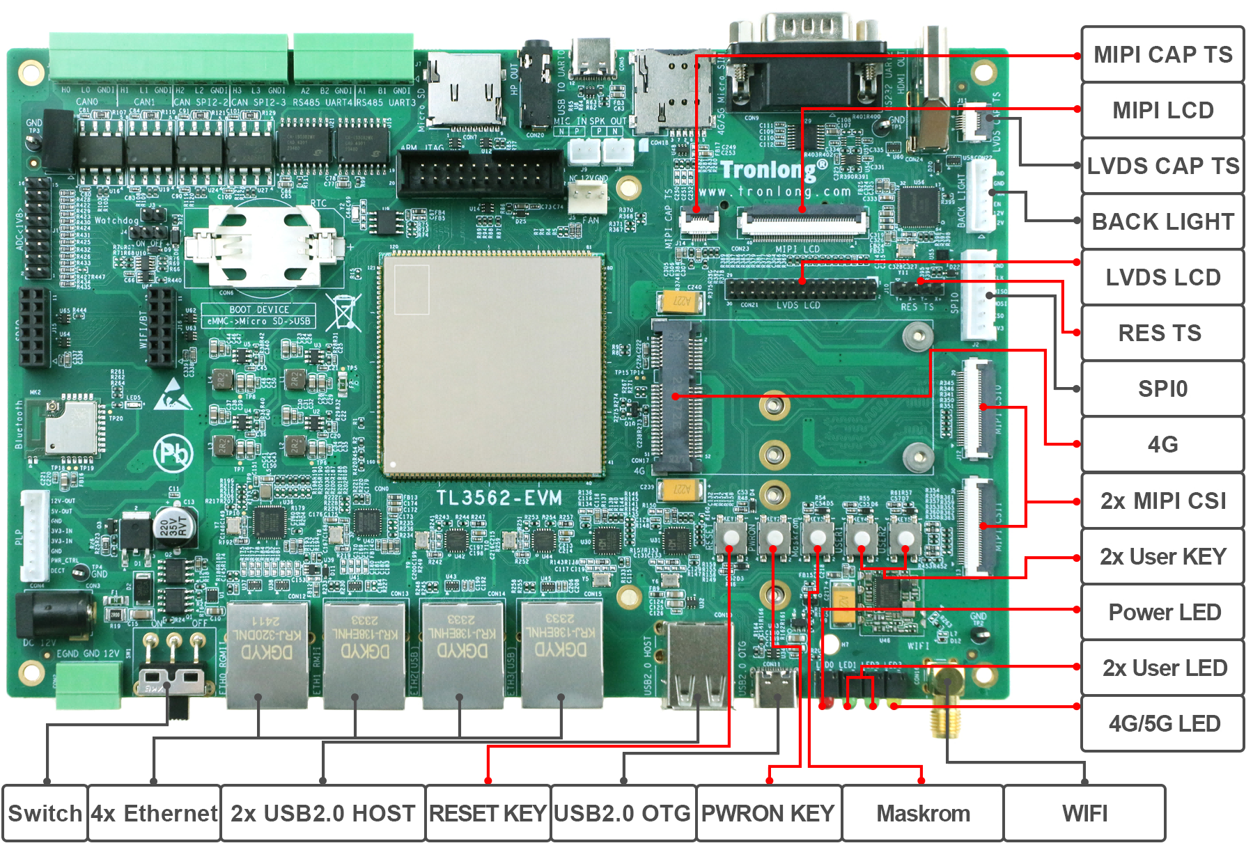 创龙科技 TL3562-EVM-B 是一款基于瑞芯微 RK3562J/RK3562 处理器设计的四核 ARMCortex-A53 +单核 ARM Cortex-M0 国产工业评估板,主频高达 2.0GHz。评估板由核心板和评估底板组成,核心板 CPU、ROM、RAM、电源、晶振、连接器等所有元器件均采用国产工业级方案,国产化率 100%。评估底板大部分元器件亦采用国产工业级方案,国产化率约 99%(按元器件数量占比,数据仅供参考)。核心板经过专业的PCBLayout 和高低温测试验证,质量稳定可靠,可满足各种工业应用环境要求。
