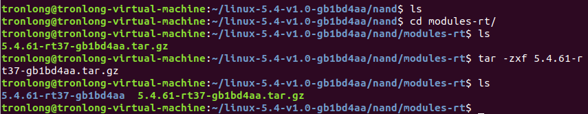 将Linux-RT内核镜像boot-rt.fex和Linux-RT内核配套的内核模块目录modules-rt拷贝至Ubuntu工作目录下,执行如下命令,进入modules-rt目录下将Linux-RT内核模块压缩包解压。