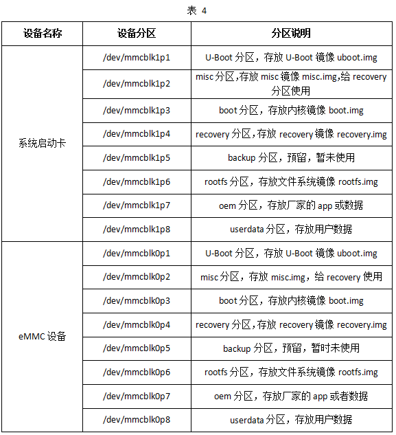 系统启动卡和eMMC分区说明如下表所示,其中系统启动卡对应的设备节点为mmcblk1,eMMC对应的设备节点为mmcblk0。