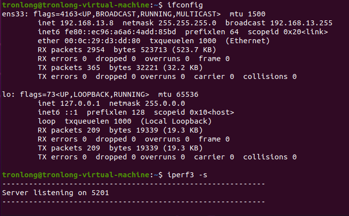 在Ubuntu执行如下命令查看IP地址,并以服务器模式启动Iperf测试。