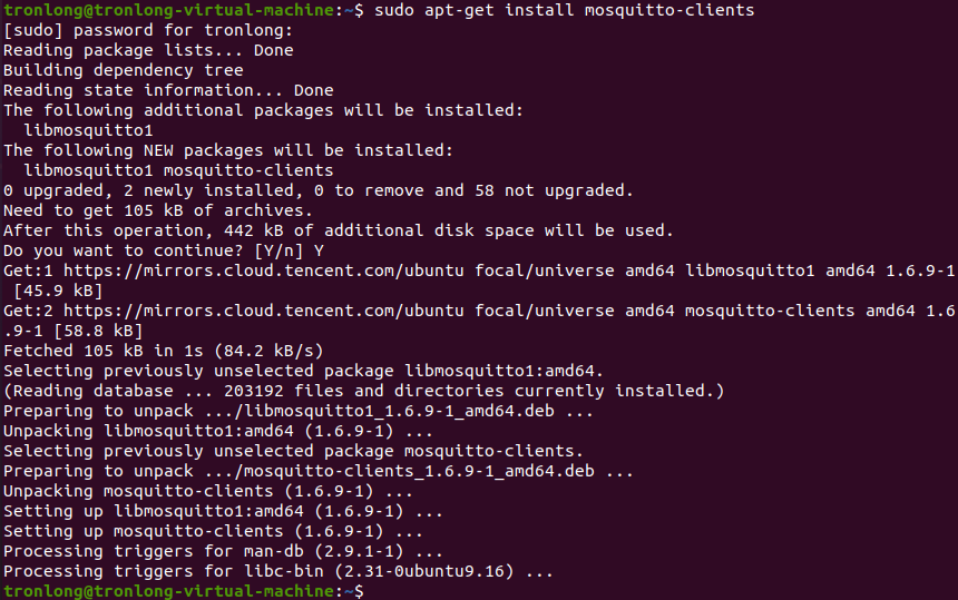 Mosquitto是一款开源的MQTT消息代理(服务器)软件,提供轻量级的、支持可发布/可订阅的的消息推送模式。我司提供的评估板文件系统已支持Mosquitto工具,本文mqtt_client案例采用Mosquitto工具演示MQTT通信协议的通信功能。由于上位机Ubuntu系统作为通信对象,因此需在Ubuntu终端执行如下命令安装Mosquitto工具,出现提示时输入"Y"并按下回车即可。