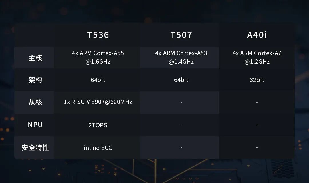 T536是一款工业级处理器,它的使命是打造一款超高性价比的工业应用处理器,原厂打出来的口号是:专为工业应用而生!它的关键参数如下: