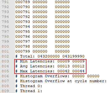 请将CPU空载状态下的统计结果no_load_output文件拷贝至Windows工作目录,使用Windows文本工具打开该文件并拖动至文件末尾,可查看Linux系统每个核心CPU0~CPU1的最小延迟(Min Latencies)、平均延迟(Avg Latencies)、最大延迟(Max Latencies)统计结果。