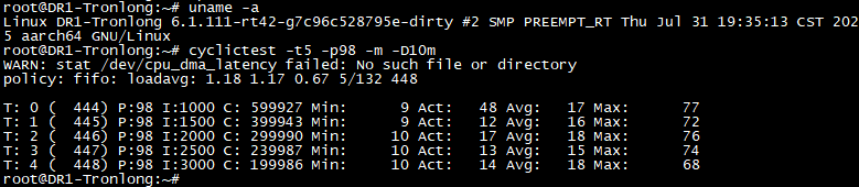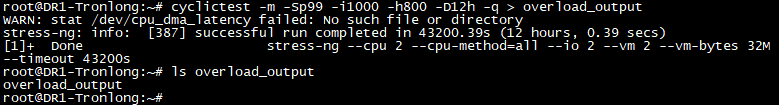 Target# cyclictest -m -Sp99 -i1000 -h800 -D12h -q > overload_output