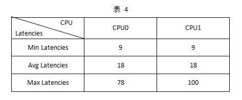 参考如上方法,分析CPU满负荷状态下的统计结果如下所示。本次测试中,CPU1核心Max Latencies值最大,为100us,CPU0核心的Max Latencies值最小,为78us。