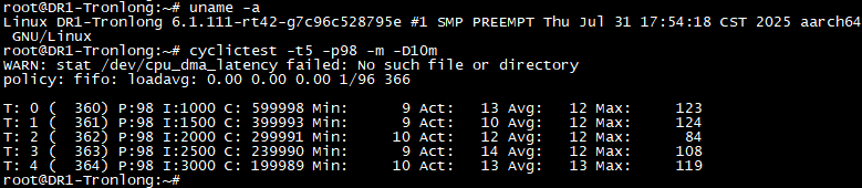 评估板文件系统默认已提供Cyclictest工具,进入评估板文件系统,执行如下命令使用Cyclictest工具测试系统实时性。