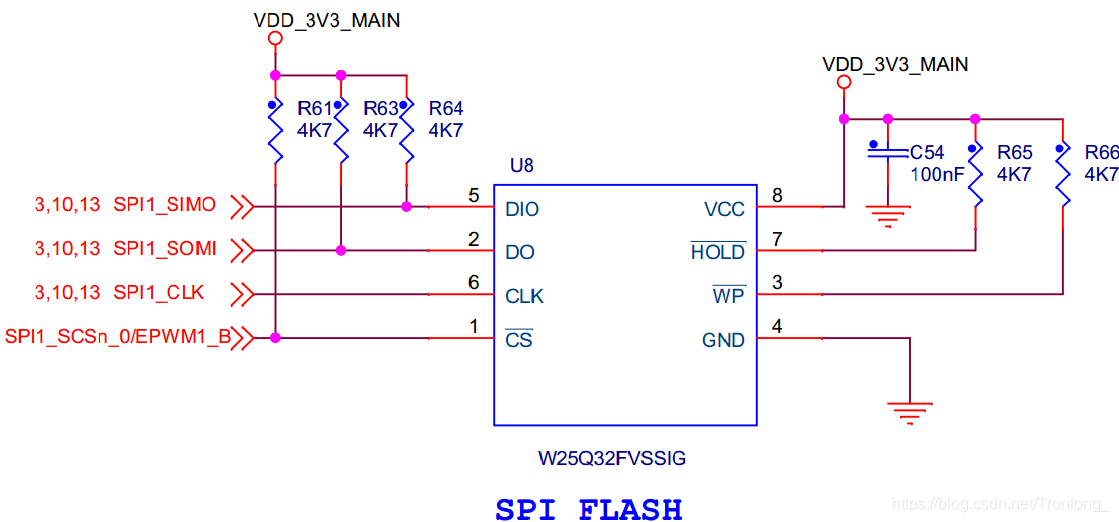 U8是1个SPI FLASH,型号为W25Q32FVSSIG,容量是4MBytes,使用SPI1的CS0。以下为SPI FLASH的电路图: