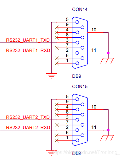 开发板共引出了3个串口,分别是CON14、CON15、CON16。CON14和CON15是由UART1和UART2通过MAX3232串口电平转换芯片得到的RS232串口,使用的是9针DB9接口。CON16则是由UART1通过ISO3082DW串口转换芯片得到的RS485串口。因此,CON14和CON16是复用的。RS232串口可以通过交叉串口线和PC互相通讯。3个串口在开发板上的位置、引脚定义如下图所示: