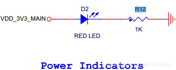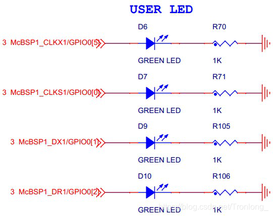 开发板底板具有1个电源指示灯D2,以及4个用户可编程指示灯,它们分别是D6、D7、D9和D10,原理图如下: