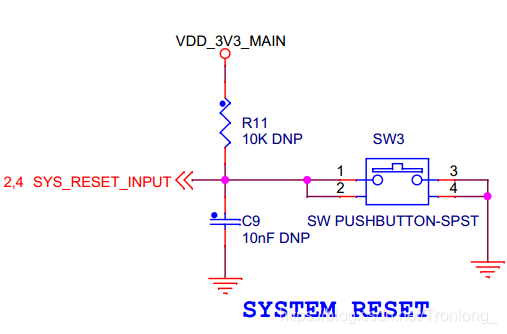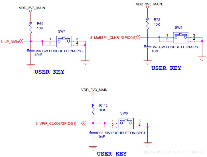 开发板总共有1个系统复位按键SW3、1个非屏蔽中断按键SW4、2个用户测试用按键SW5和SW6,原理图如下:
