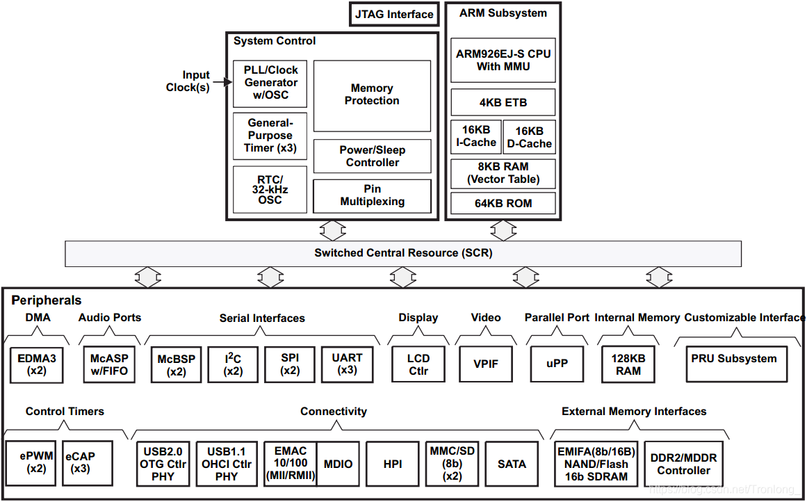 TI AM1808是一款低功耗嵌入式32位工业处理器。拥有多种工业级接口资源,以下是AM1808 CPU的资源框图: