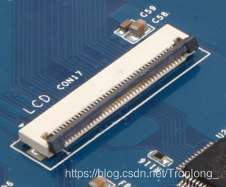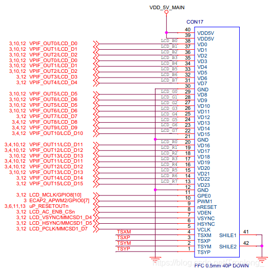 CON17带有40pin、0.5mm间距LCD触摸屏接口,也叫FFC排线座。LCD接口座中包含了常见LCD所用的全部控制信号(行场扫描、时钟和使能等)。其中,1、2、3、4四线为触摸屏接口,接口定义如下图所示: