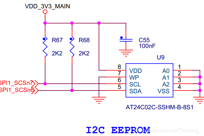 U9是1个I2C总线接口的EEPROM,型号为AT24C02C,容量是256Bytes,地址是0x50(高7位)。以下为EEPROM的电路图: