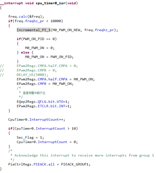 InitMeasureSpeed函数中,cpu_timer0_isr定时器中断函数中定时采集速度,并用于PID算法。freq.freqhz_pr为采集的电机脉冲数,M0_PWM_ON为高电平时间,M0_PWM_ON_NEW为新的高电平时间,PWM_ON_PID是经过PID算法后的高电平时间。cpu_timer0_isr定时器中断函数如下: