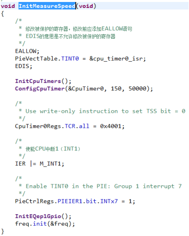 主函数中首先初始化系统控制,配置CPU主频、寄存器和初始化PIE控制等。调用InitMeasureSpeed函数初始化时钟、中断等。InitMeasureSpeed函数如下: