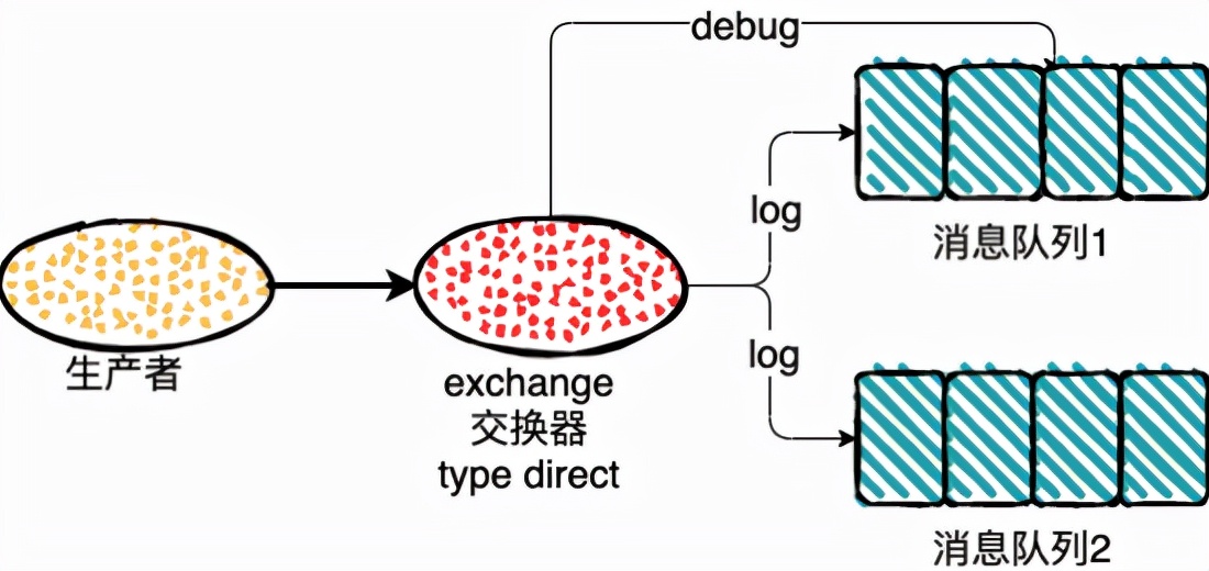 如果发送消息的路由键也就是 RoutingKey,为 log 的时候,两个消息队列都会收到消息,如果路由键为 debug ,exchange 只会把消息发送到消息队列1中。