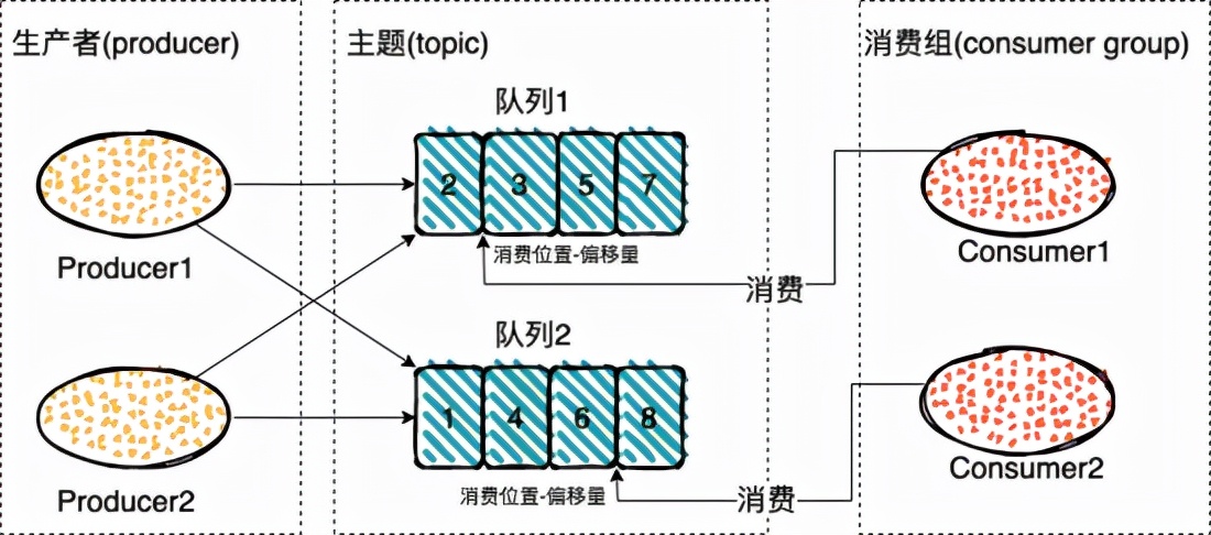 生产者(Producer)产生消息,进行入队操作,消费者(Consumer)接收消息,就是出队操作,存在于服务端的消息容器就称为消息队列。