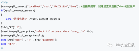 上述代码,程序获取GET参数id,对用户传过来的id值没有进行过滤,直接拼接到SQL语句中,在数据库中查询id对应的内容,并将这一条查询结果中的user和password 输出到页面。就可以进行常规的union注入。