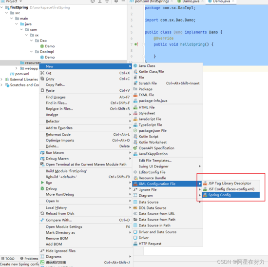 在resources资源目录点击右键,依次选择New-->XML Configuration File-->Spring Config,创建applicationContext.xml的配置文件