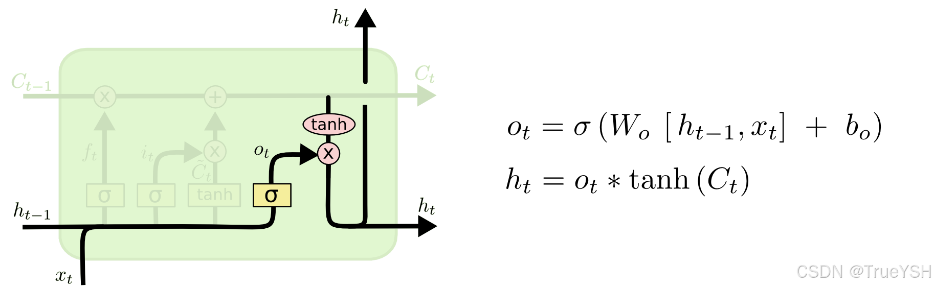 输出门决定从记忆细胞输出的信息,以及如何结合长期和短期记忆以形成下一个隐藏状态 h_t。
