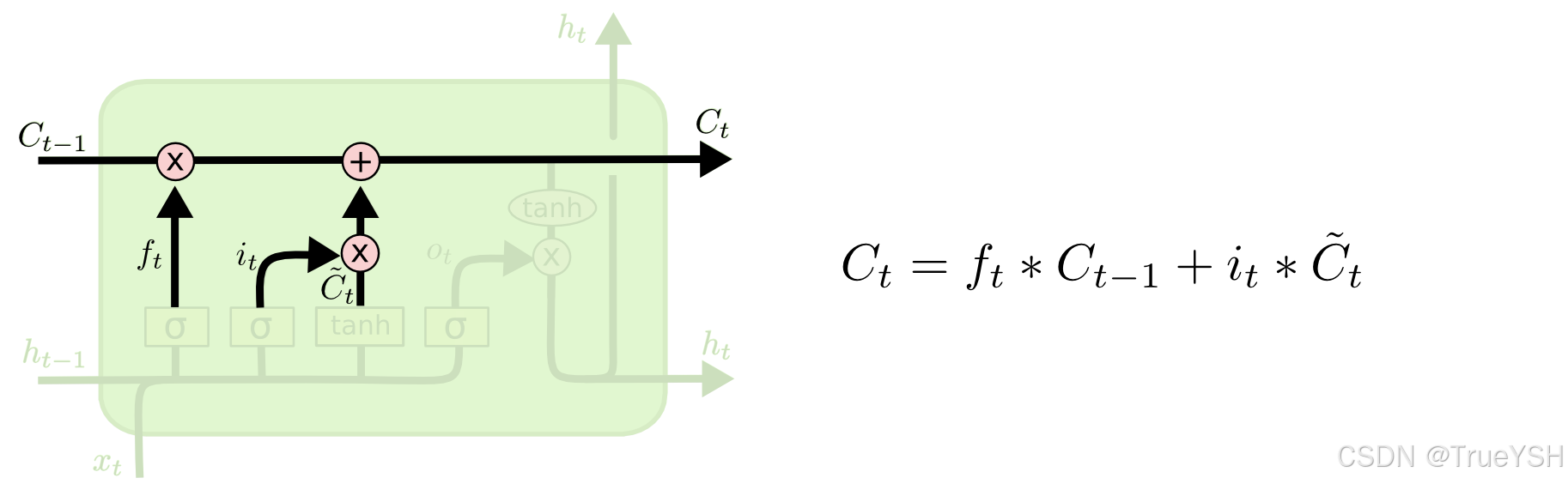 首先,使用上一时刻的记忆信息 C_(t-1),经过 Sigmoid 激活函数归一化之后得到向量 P。这个向量实际上是一个信息选择向量,里面的值越接近于 1,则越倾向于保留对应维度的信息;越接近于 0,则代表越倾向于遗忘对应维度的信息。与此同时,基于相同的输入向量 E(来自遗忘门的计算),送入 Tanh 激活函数,得到新的候选记忆向量 Q。此向量包含可能添加到记忆细胞的新信息。然后,将向量 P 和 Q 按元素相乘,得到向量 S。这一步骤实际上是将输入信息 Q 中有价值的部分有选择性地记录下来,作为短期记忆的一部分存储在向量 S 中。