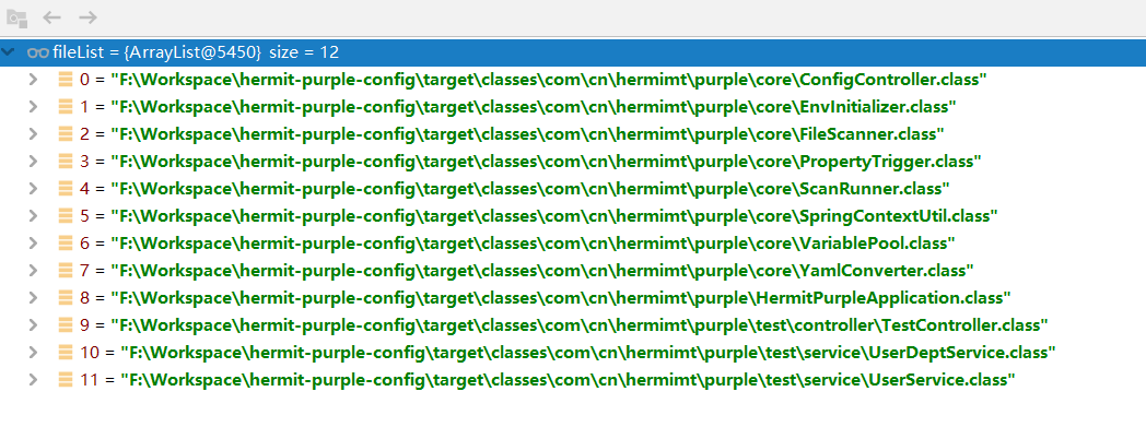 真正实现文件扫描功能是调用的FileScanner,它的实现我们后面具体再说,在功能上它能够根据文件后缀名扫描某一目录下的全部文件,这里首先扫描出了target目录下全部以.class结尾的文件: