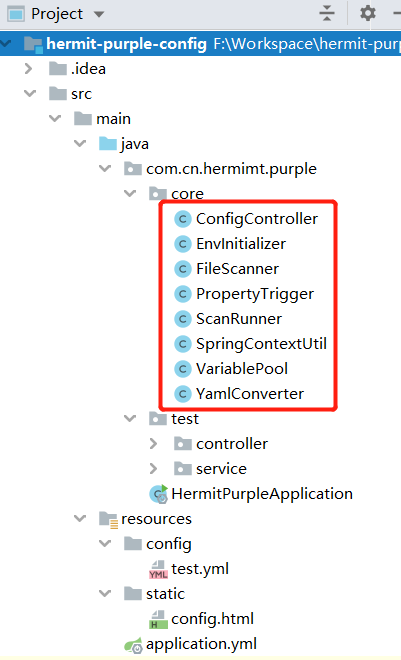 之所以说是简易版本,首先是因为实现的核心功能就只有配置修改后实时生效,并且代码的实现也非常简单,一共只用了8个类就实现了这个核心功能,看一下代码的结构,核心类就是core包中的这8个类: